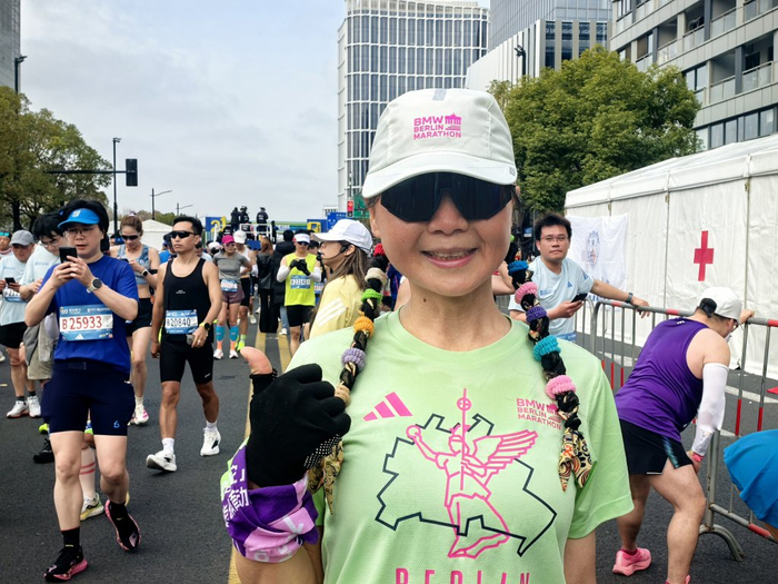杨芬的彩色头绳在众多跑者中格外吸睛,谈起跑步,她表示因年过五旬想着锻炼身体,在退休后她就尝试跑步,没想到这一跑就是八年。59岁的她跑遍了上马系列的各类赛事,10公里、半马、全马,从未停下脚步。