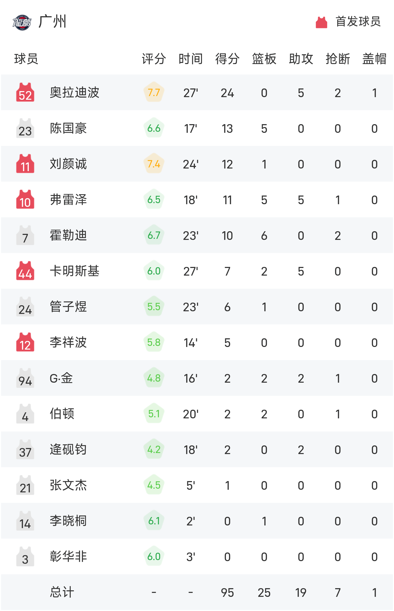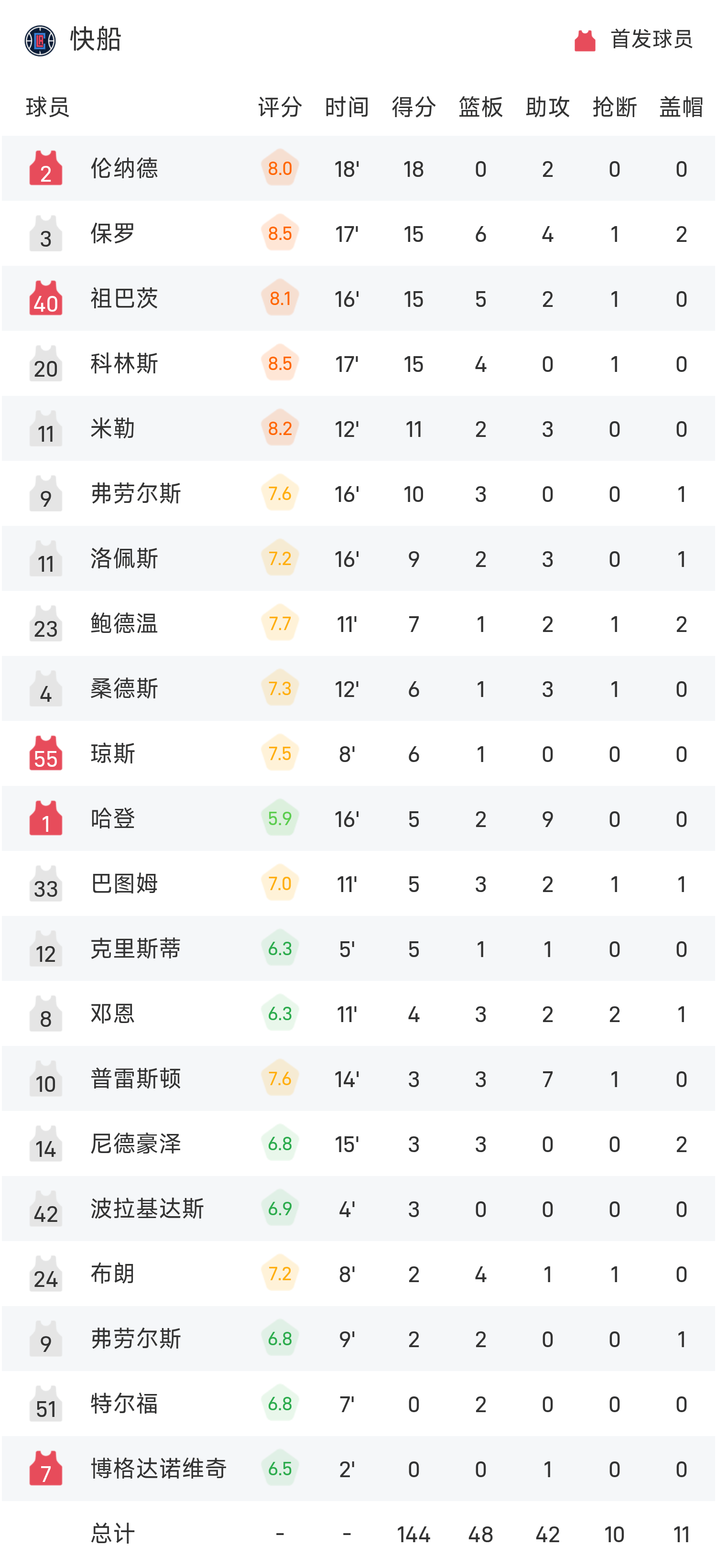 10月10日讯 25/26赛季NBA 季前赛,快船对阵广州。双方全场战罢,快船142-95战胜广州。伦纳德得到18分2助率队取胜,奥拉迪波空砍全场最高的24分5助。